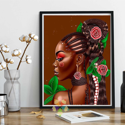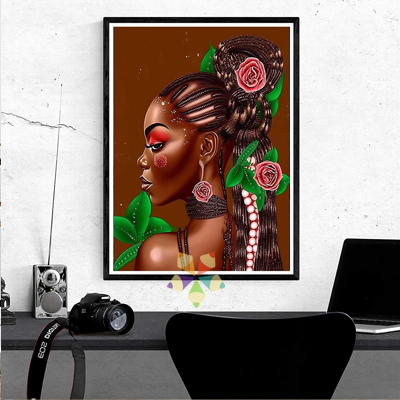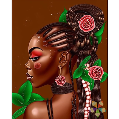 Los colores intensos contrastan con la serenidad que transmite esta mujer africana elegantemente adornada. Este es un Diamond Painting que rinde homenaje a la belleza femenina y la la cultura afrodescendiente.