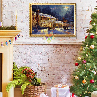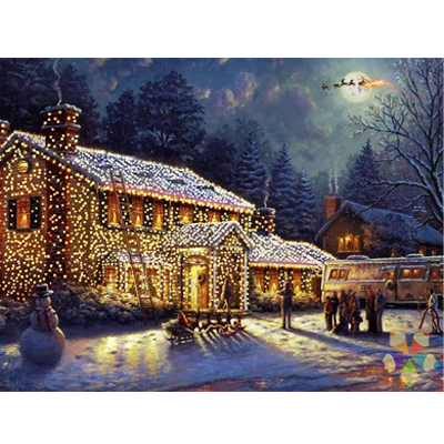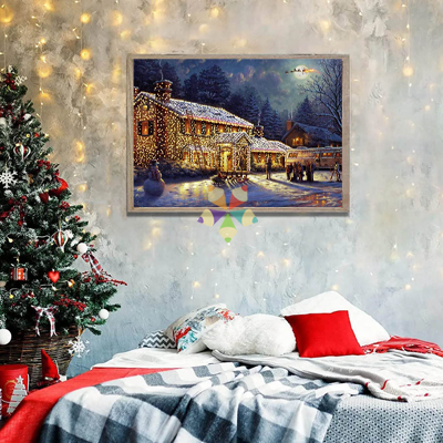 Una escena llena de magia y fantasía... Una casita su jardín invernal adornado con luces, un arbolito navideño y un muñeco de nieve, es un paisaje lleno de color y brillo para llenar su hogar de este espíritu de temporada.