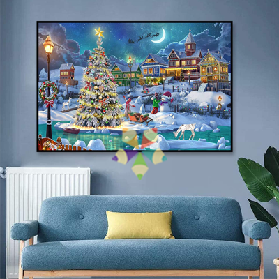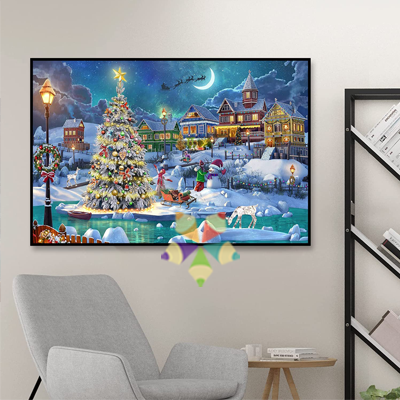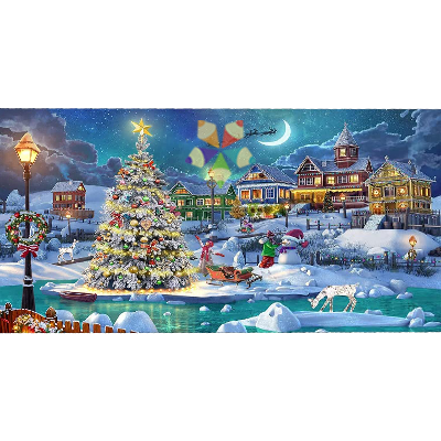 Una escena llena de magia y fantasía... Un enorme árbol de navidad, rodeado por muñequitos de nieve, trineos y un pueblito decorado bajo el cielo estrellado, es un paisaje lleno de color y brillo para llenar su hogar de este espíritu de temporada.