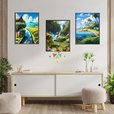 Este Diamond Painting es una invitación a sentir toda la intensidad, los aromas y la brisa marina. El cielo y el mar envuelven una cabañita solitaria frente a la playa y en el fondo las siluetas de las ciudad contrastan con la fuerza viva de este paisaje natural.