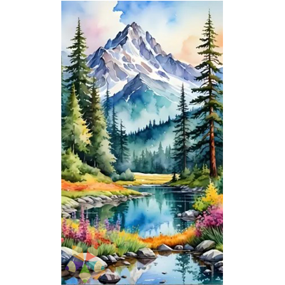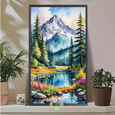 Este río de aguas cristalinas, brota entre los picos rocosos y bosques de pinos de los Alpes, y se convierte en un espejo que refleja con una inmensa calma toda la belleza de este paisaje de Diamond Painting.