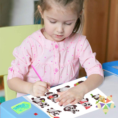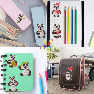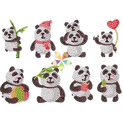 Este es un set de Diamond Painting con todos los materiales y herramientas para elaborar 8 Stickers de ositos Panda, que son un pasatiempo emocionante y divertido para los chicos de la casa.