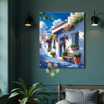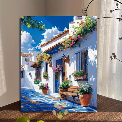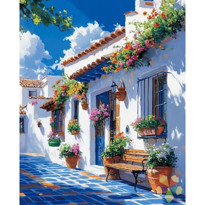Una bellísima casa colonial, con su rústica puerta de madera, de un color celeste intenso coronada por un techito de tejas, evoca los paisajes mediterráneos. Es un Paint by Numbers elegante y hogareño!