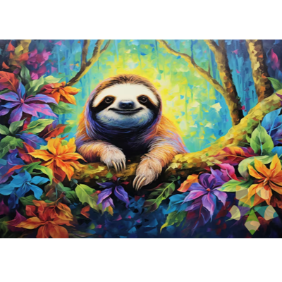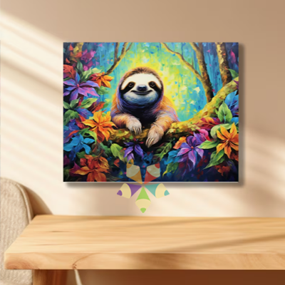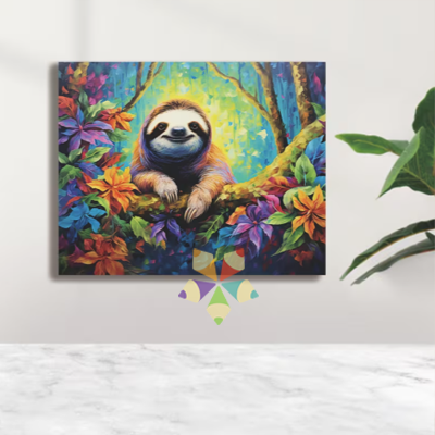 Los osos perezosos de tres dedos (especie Barypus variegatus) son uno de nuestros símbolos nacionales. Este colorido lienzo en Paint by Numbers de un risueño perezoso, rodeado de vegetación colorida es exuberante!!